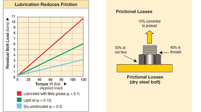 Lubrication reduces the friction during tightening, decreases bolt failure during installation and increases bolt life. Variation in friction coefficients affect the amount of preload achieved at a specific torque. Higher friction results in less conversion of torque to preload. The value for the friction coefficient provided by the lubricant manufacturer must be known to accurately establish the required torque value.
