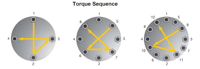 When torquing it is common to tighten only one bolt at a time, this can result in Point Loading and Load Scatter. To avoid this, torque is applied in stages following a prescribed pattern: